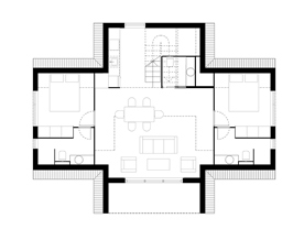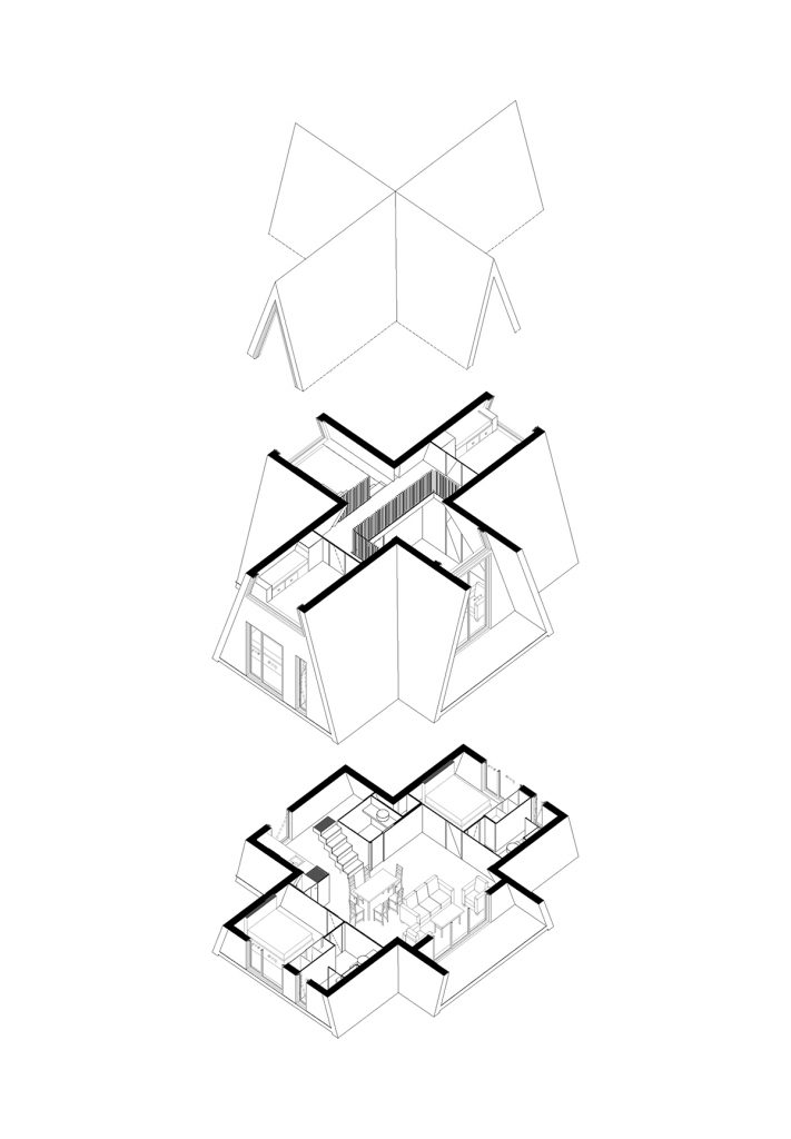 Estas dos A-Frame entrelazadas dan lugar a un espacio de salón a doble altura que fuga hacia el cielo. Las dos habitaciones principales en planta baja y las dos de invitados en la planta superior dan cabida a familia e invitados.